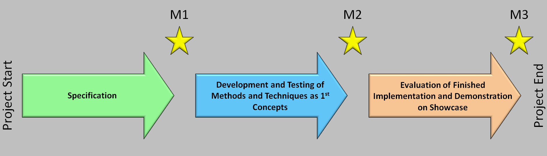 Milestone M3: “Finished Implementation, Demonstration on Showcase” marks end of phase 3